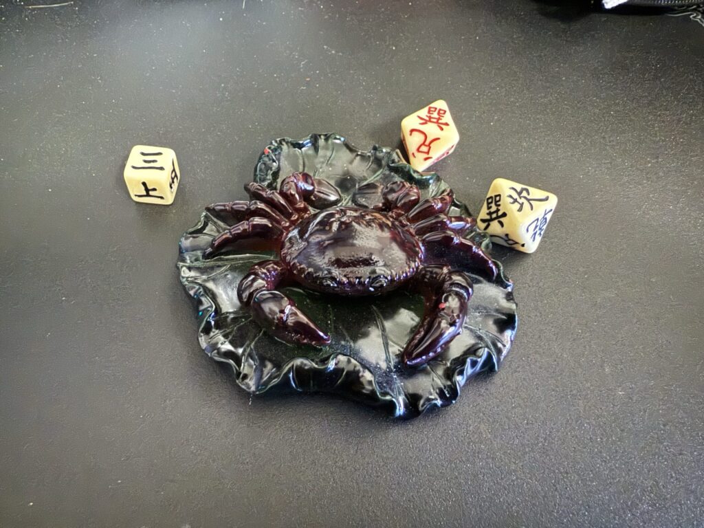 Also I got some I-Ching dice (I am firmly a coin method guy thus far) and a completed unrelated pair of crabby tea pets.