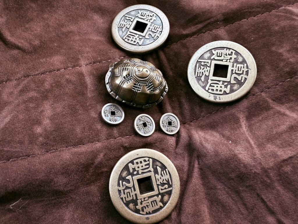 Mini I-Ching (Yijing 易經) coins and turtle.